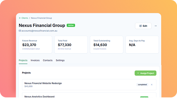 Your clients get full visibility — what they've paid, what's coming up, what work it relates to. They log in, they pay, they're done.